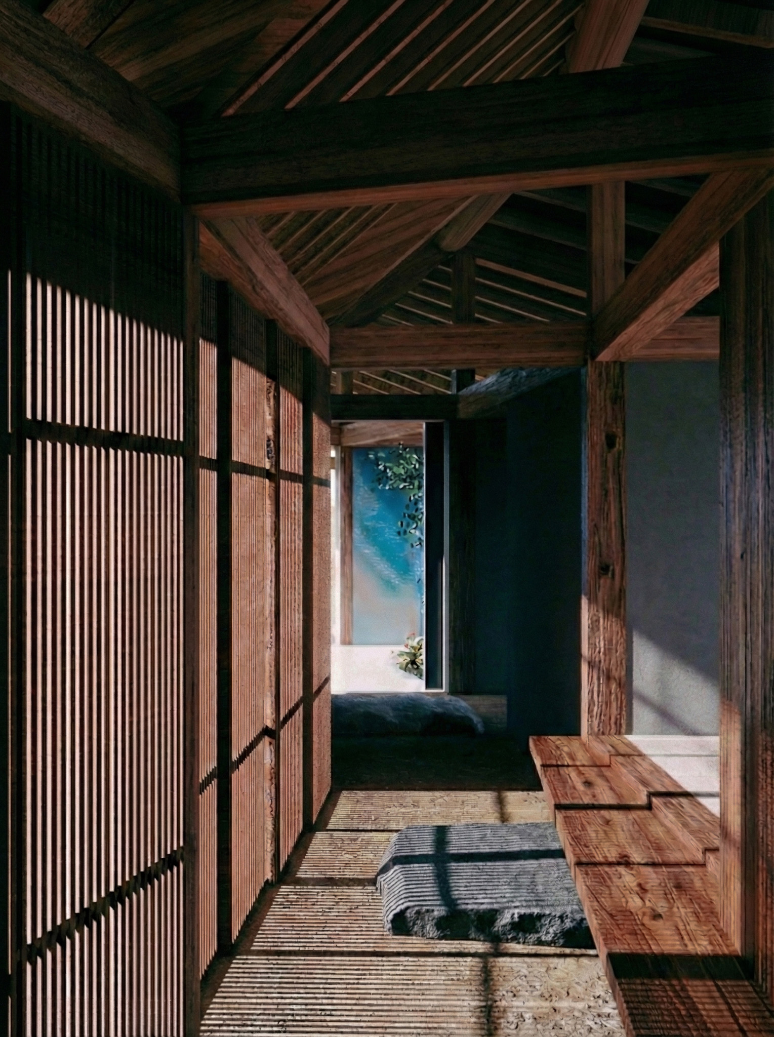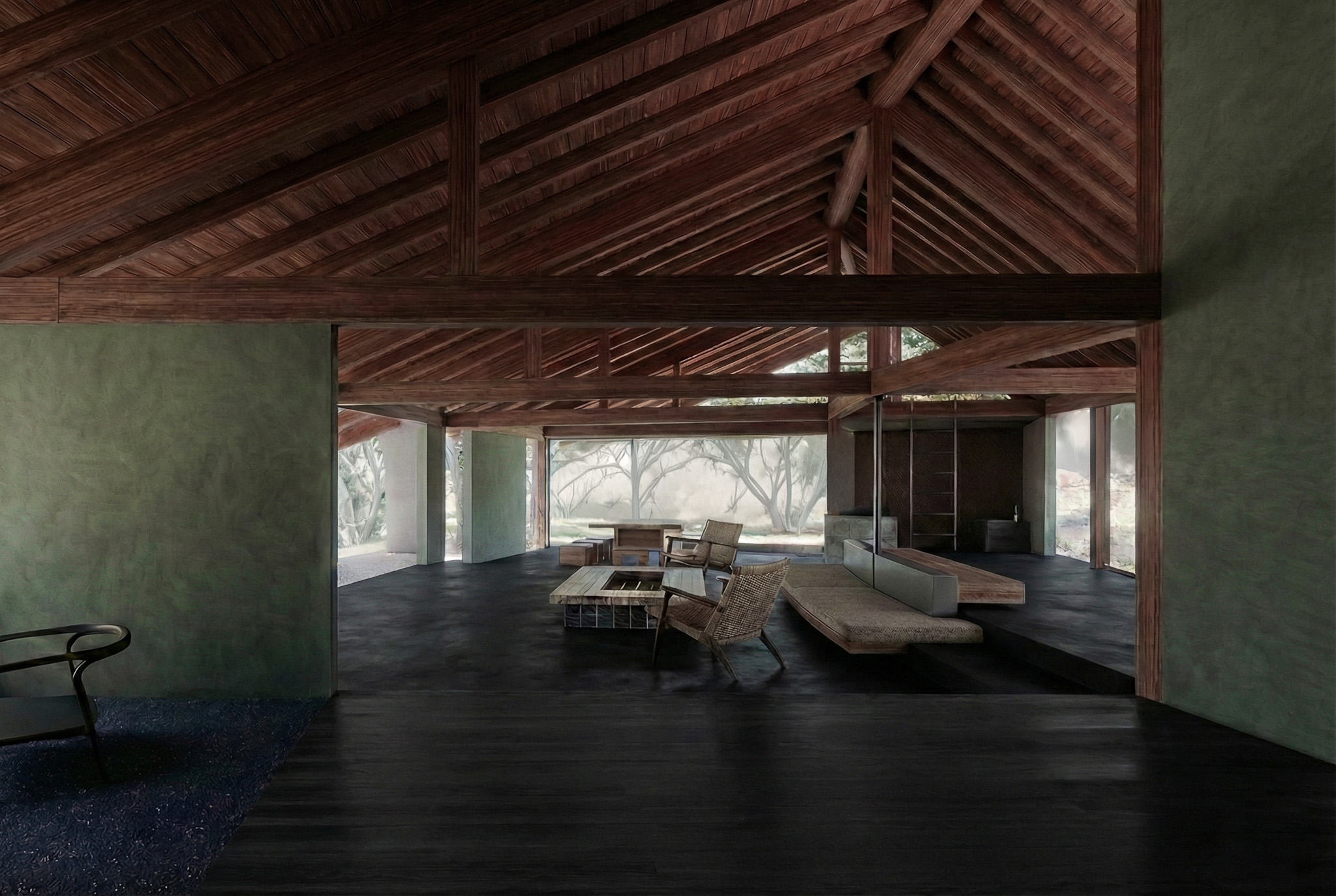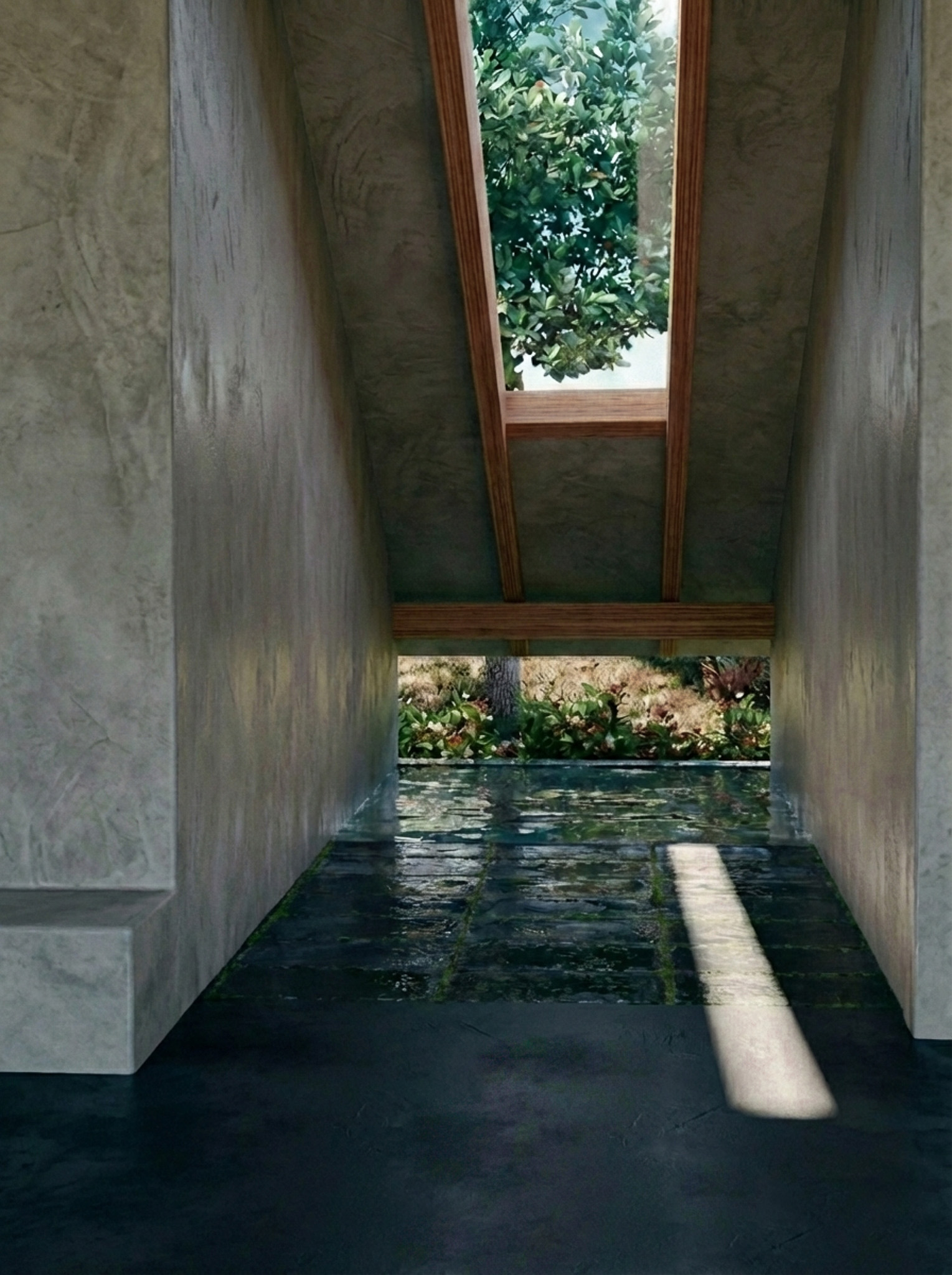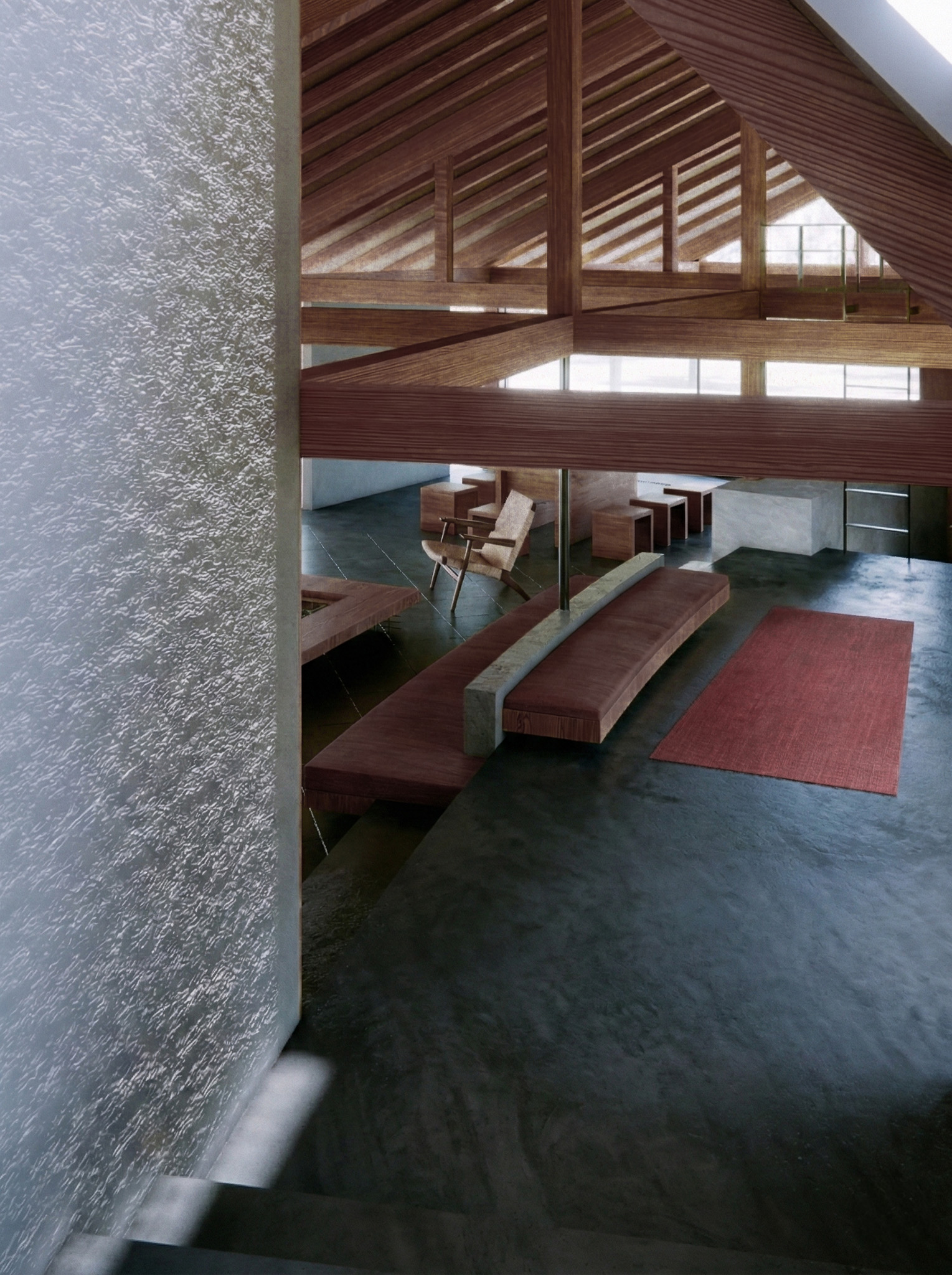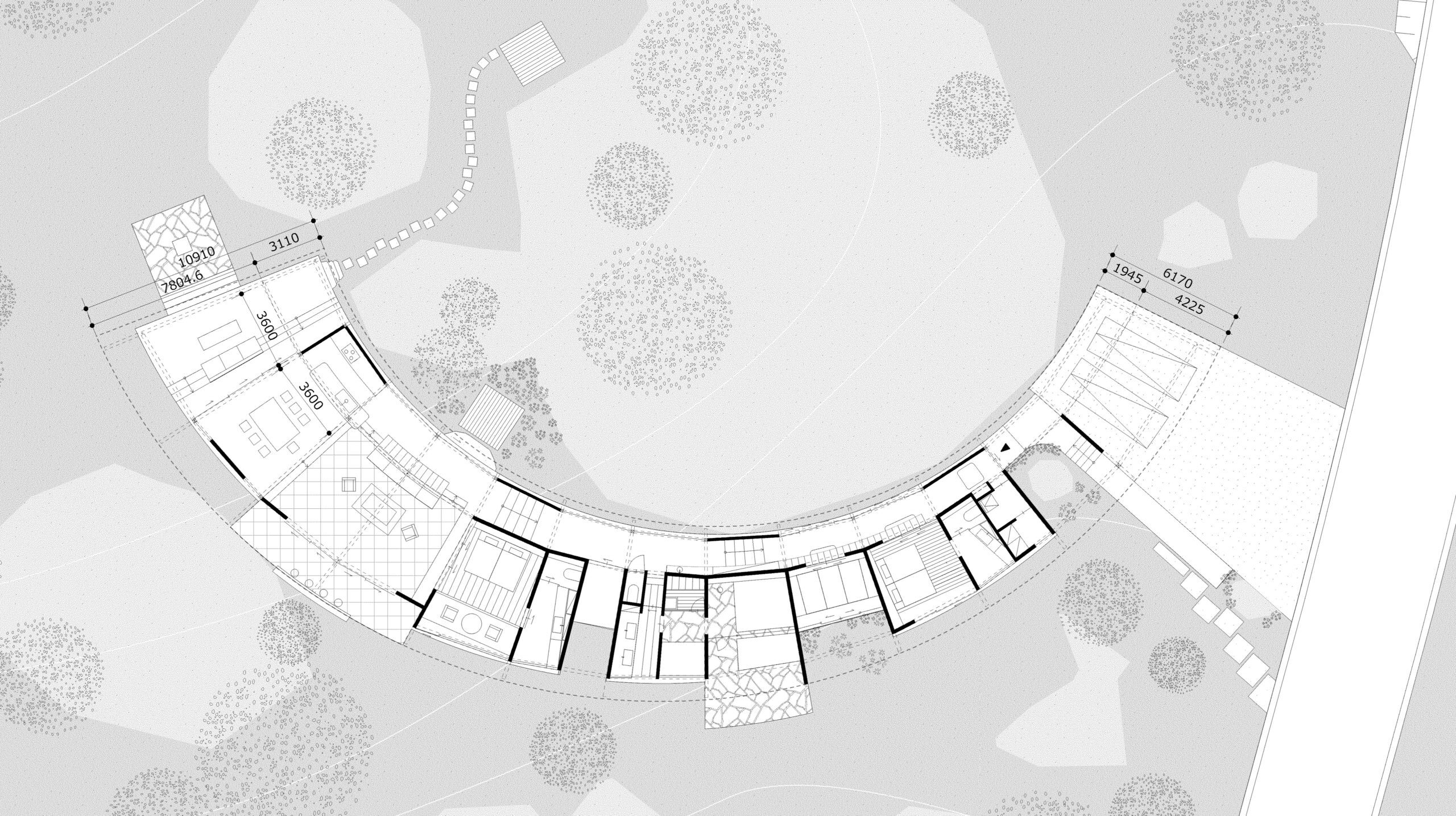 敷地内にあった大きな岩や樹木の隙間、4m程の高低差、四季の変化、それらの自然から距離を取るのではなく、その場所、状態に寄り添い、ポテンシャルを最大化するような、やわらかな建築の有り方を提案した。