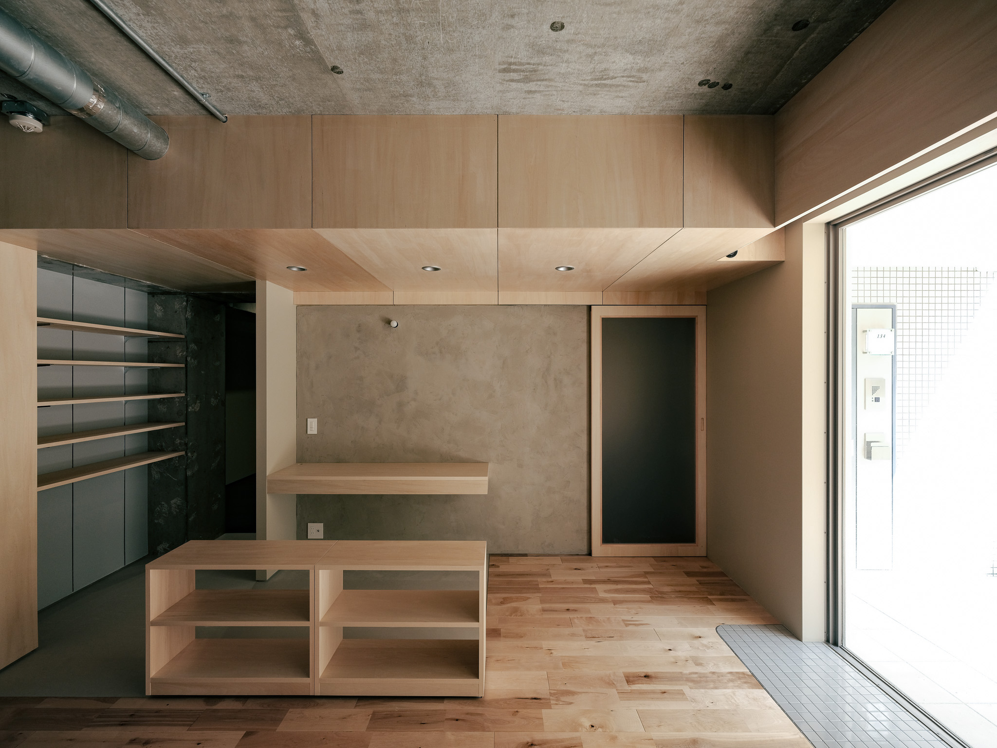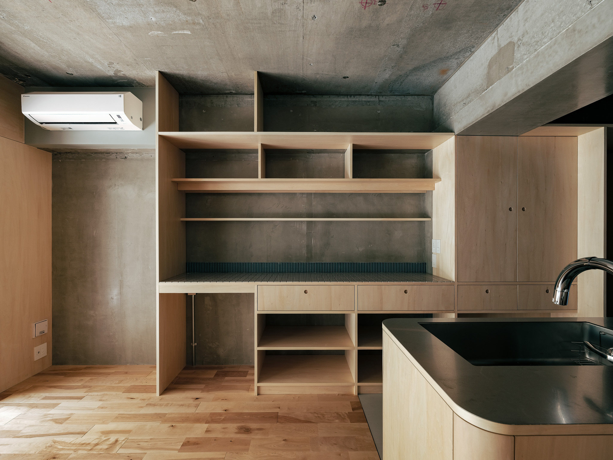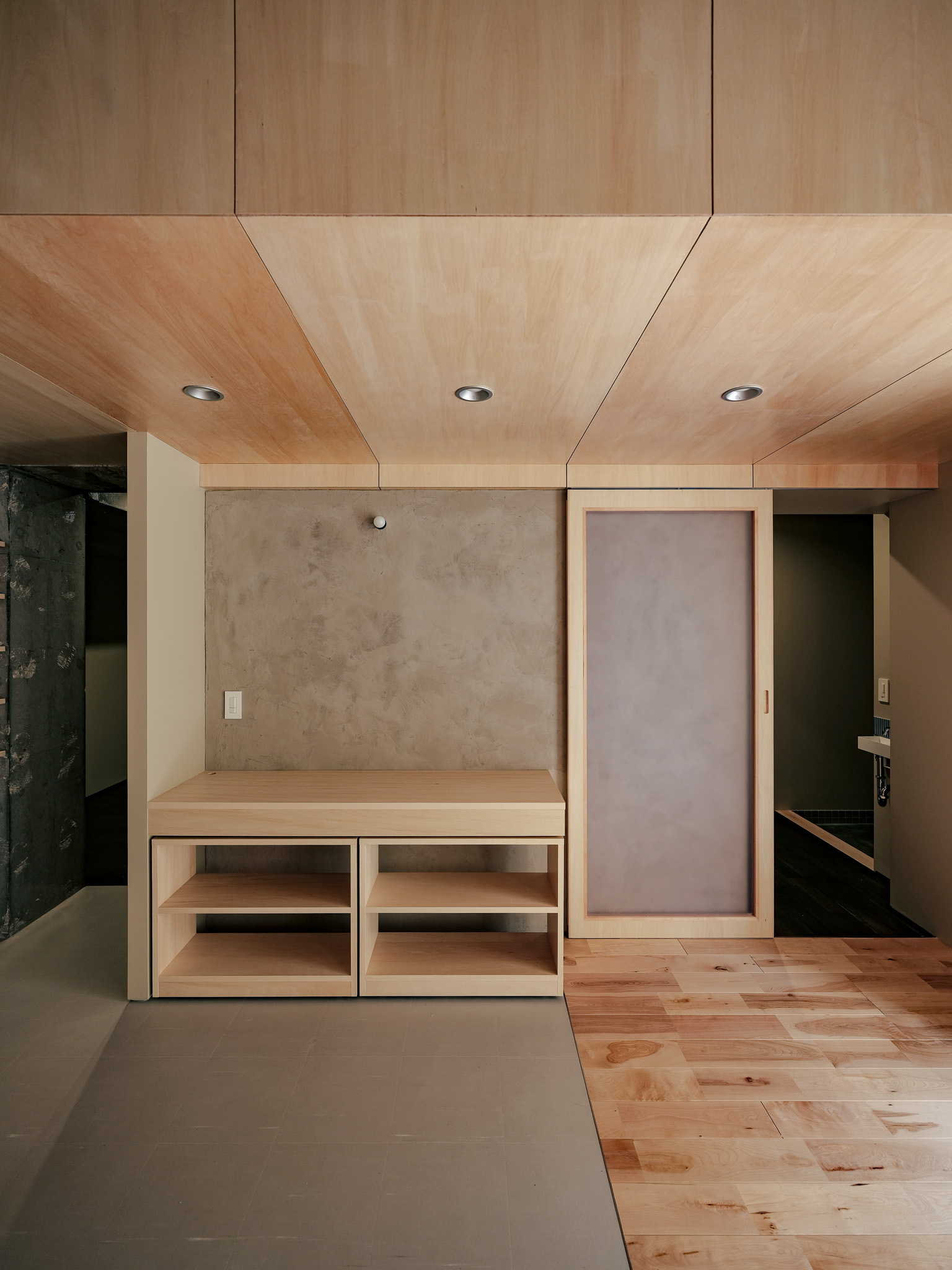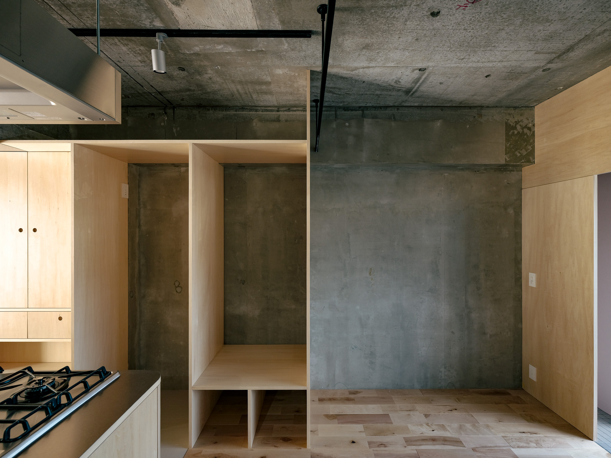 可動家具と無数の袖壁が取り付く、人や物の居場所となる境界面。