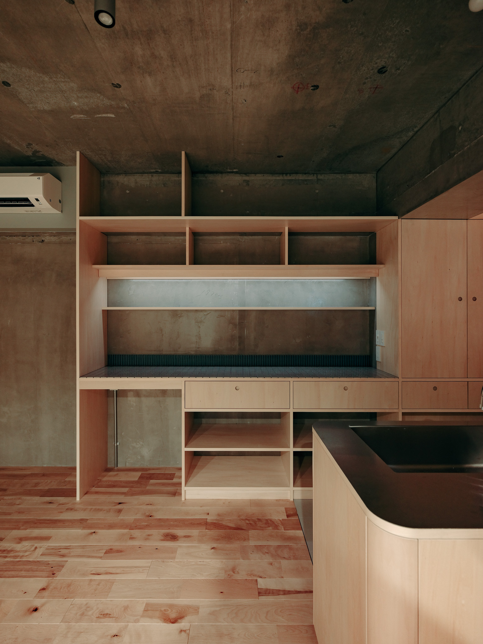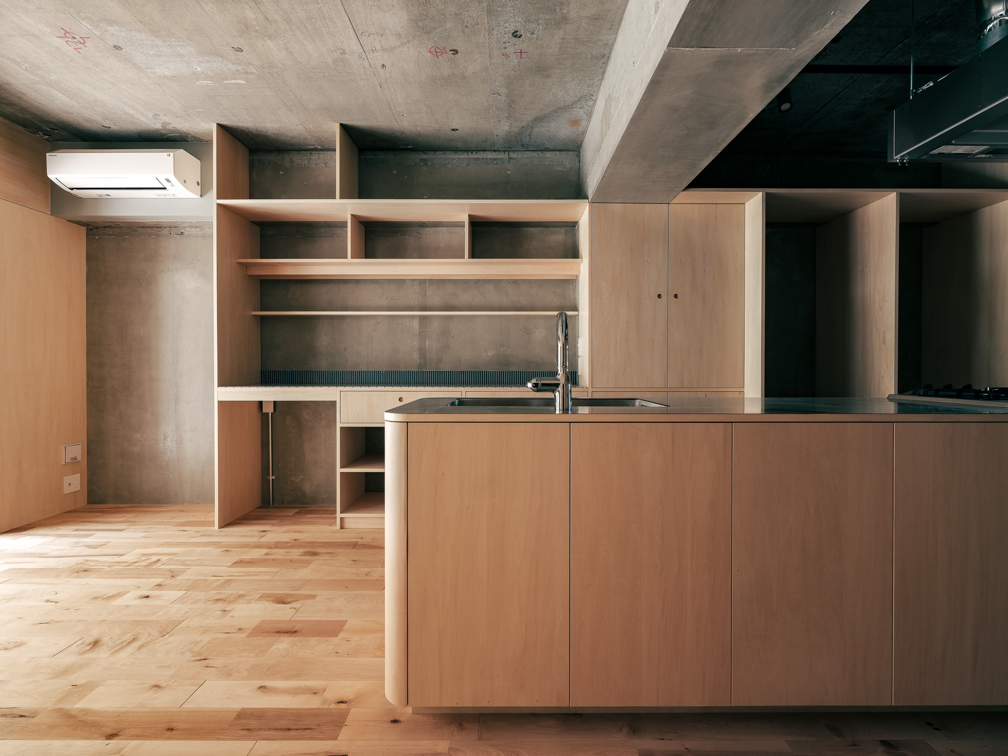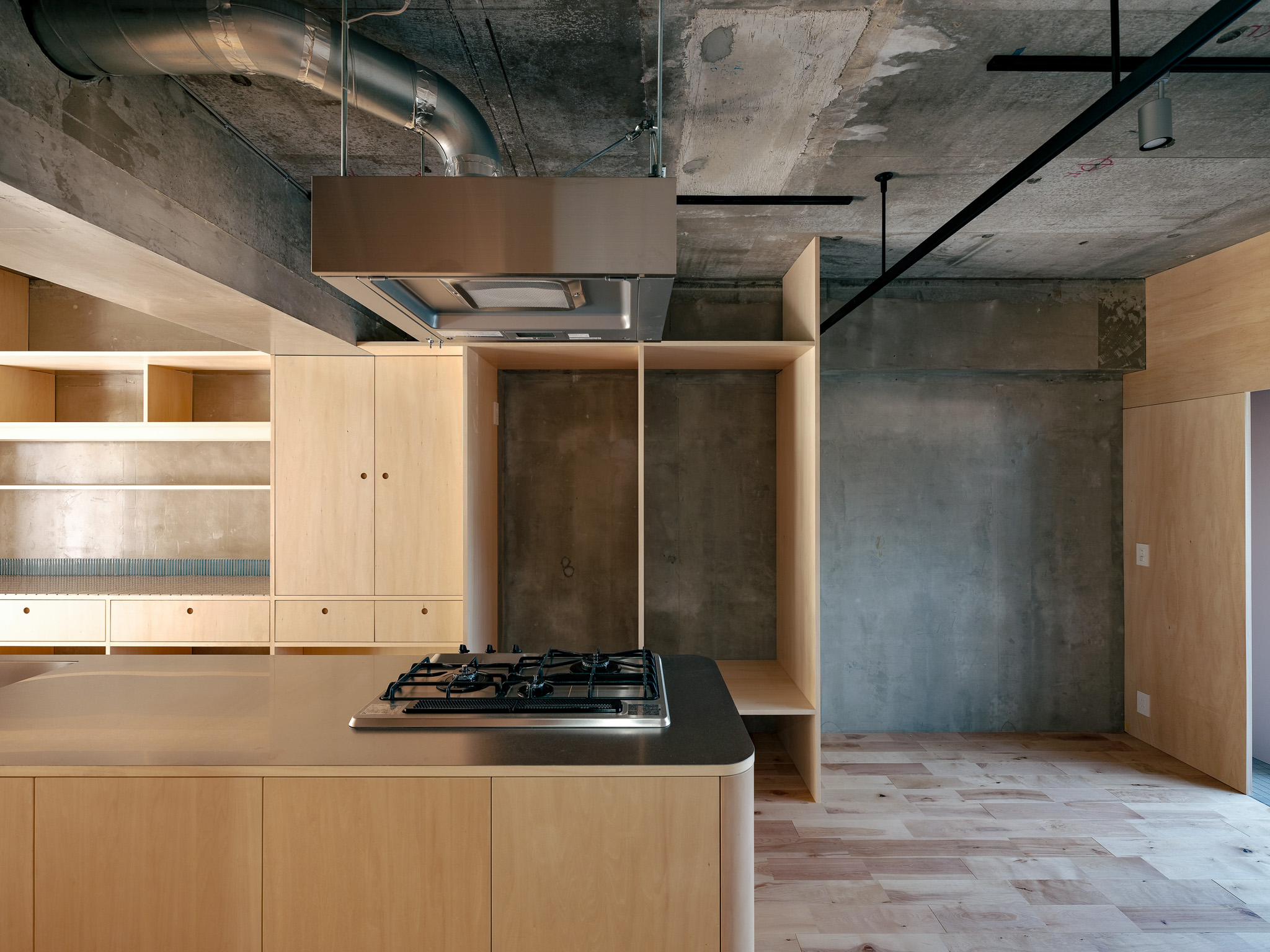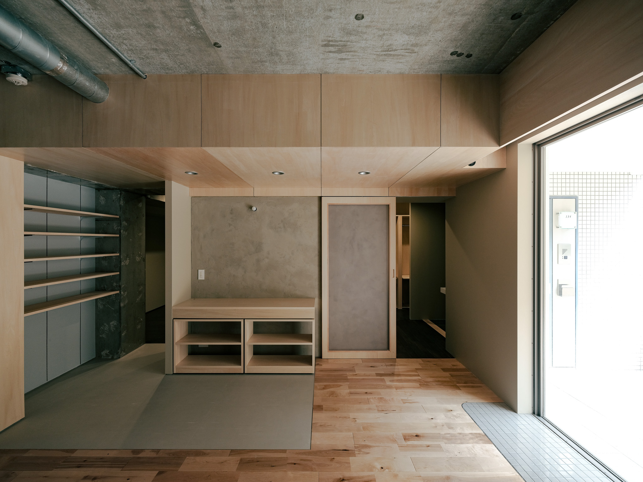 可動家具と無数の袖壁が取り付く、人や物の居場所となる境界面。
