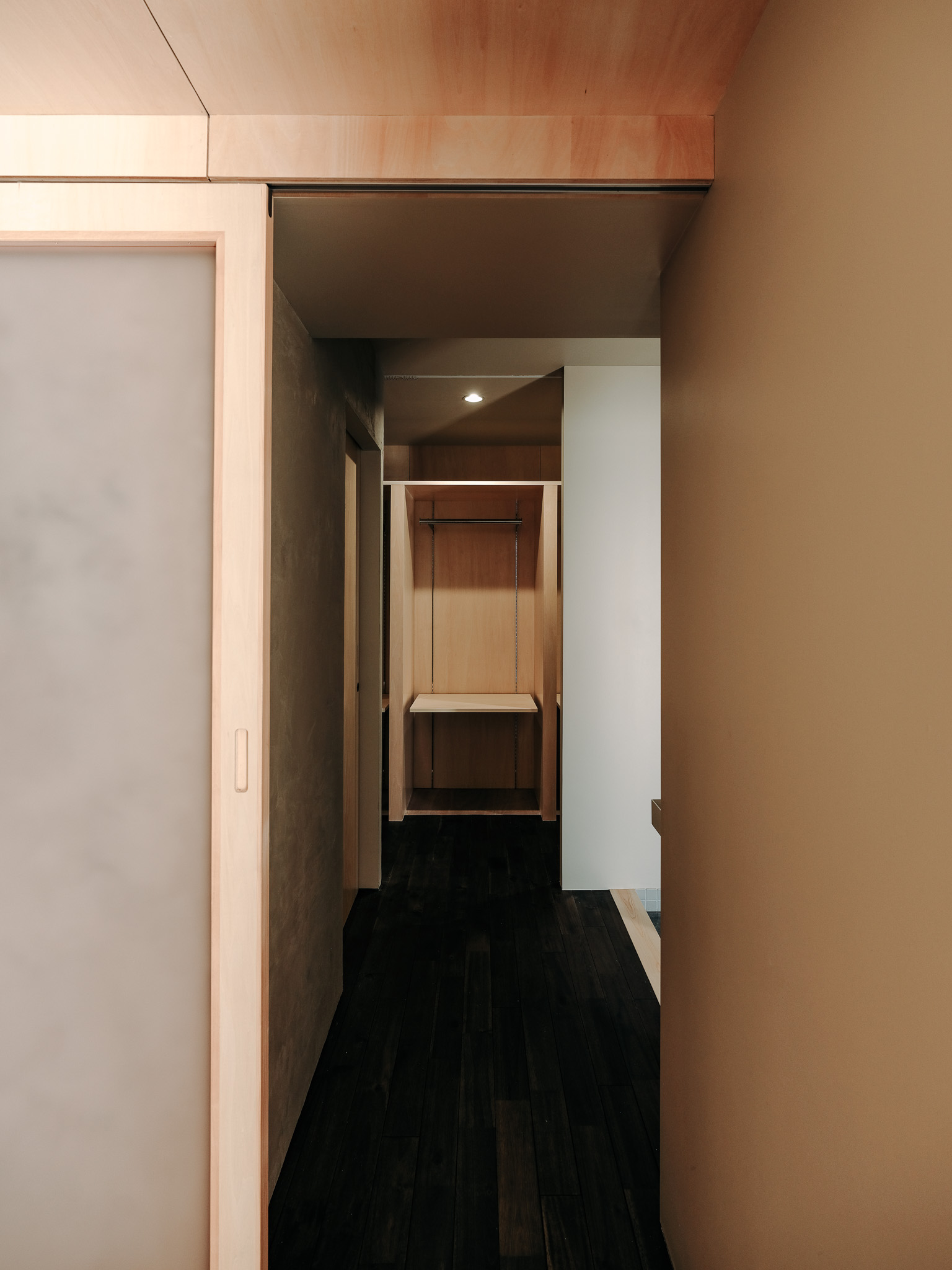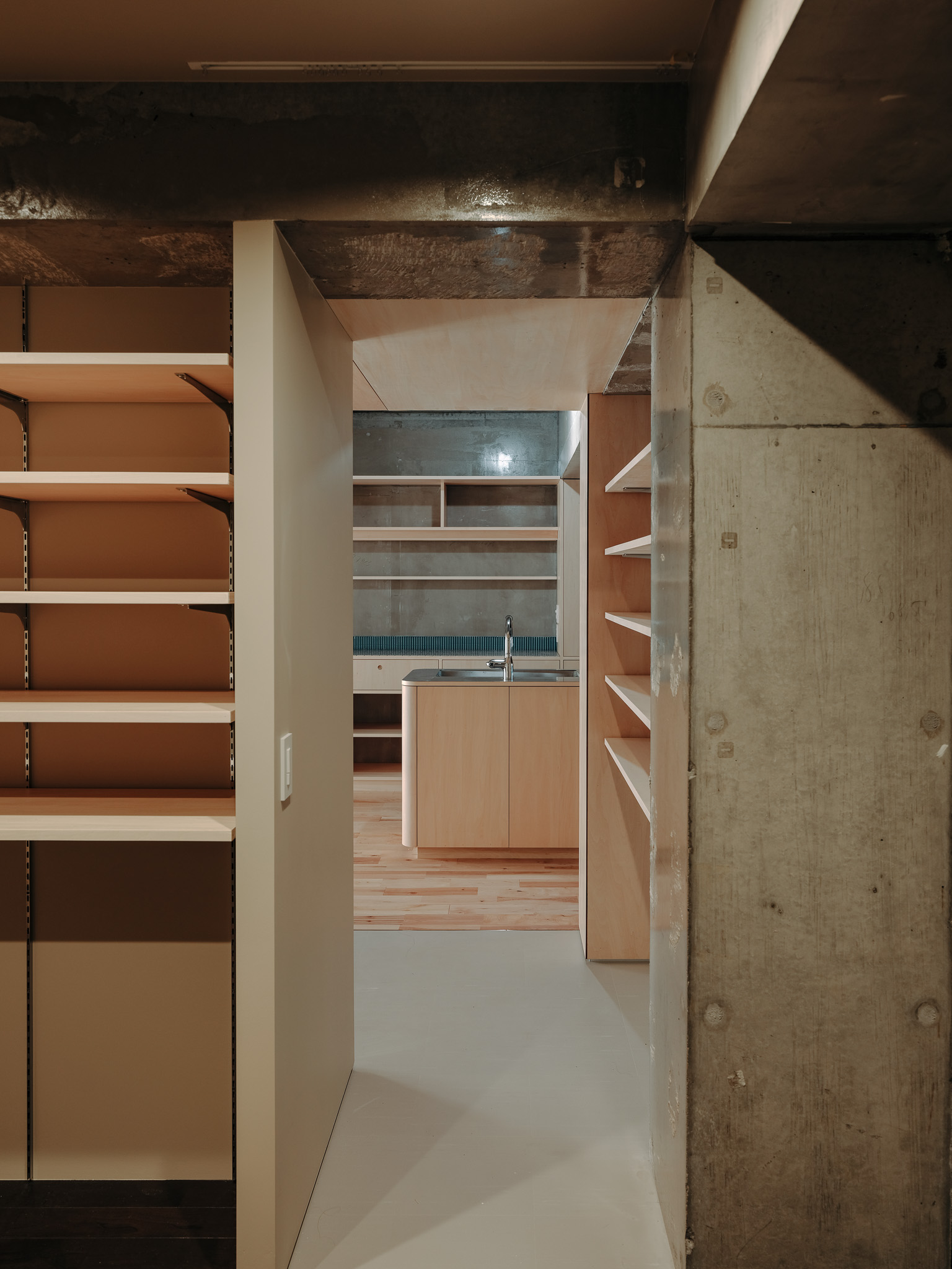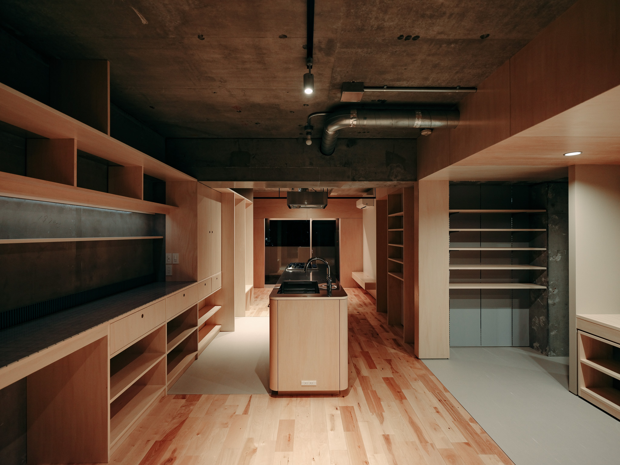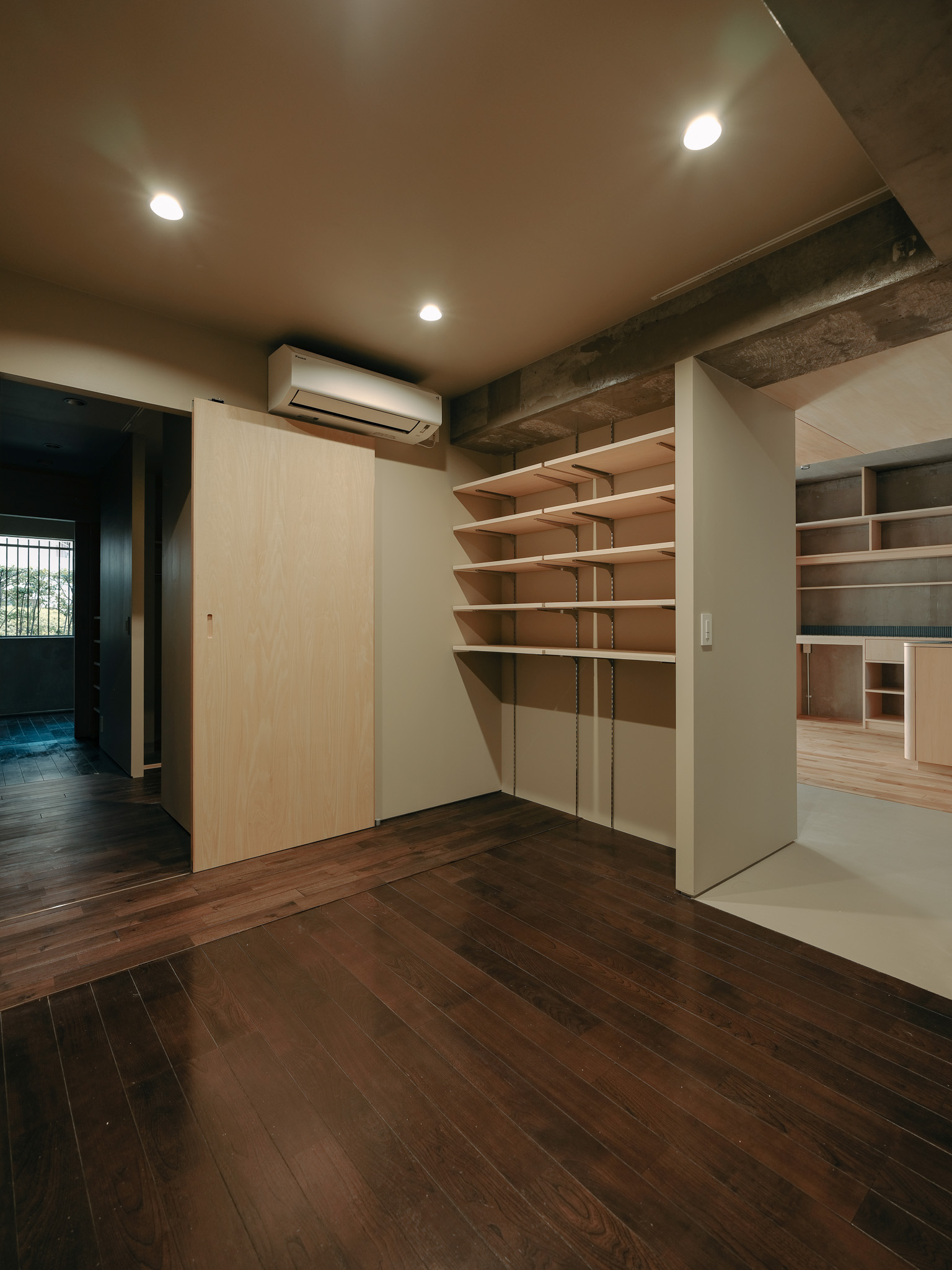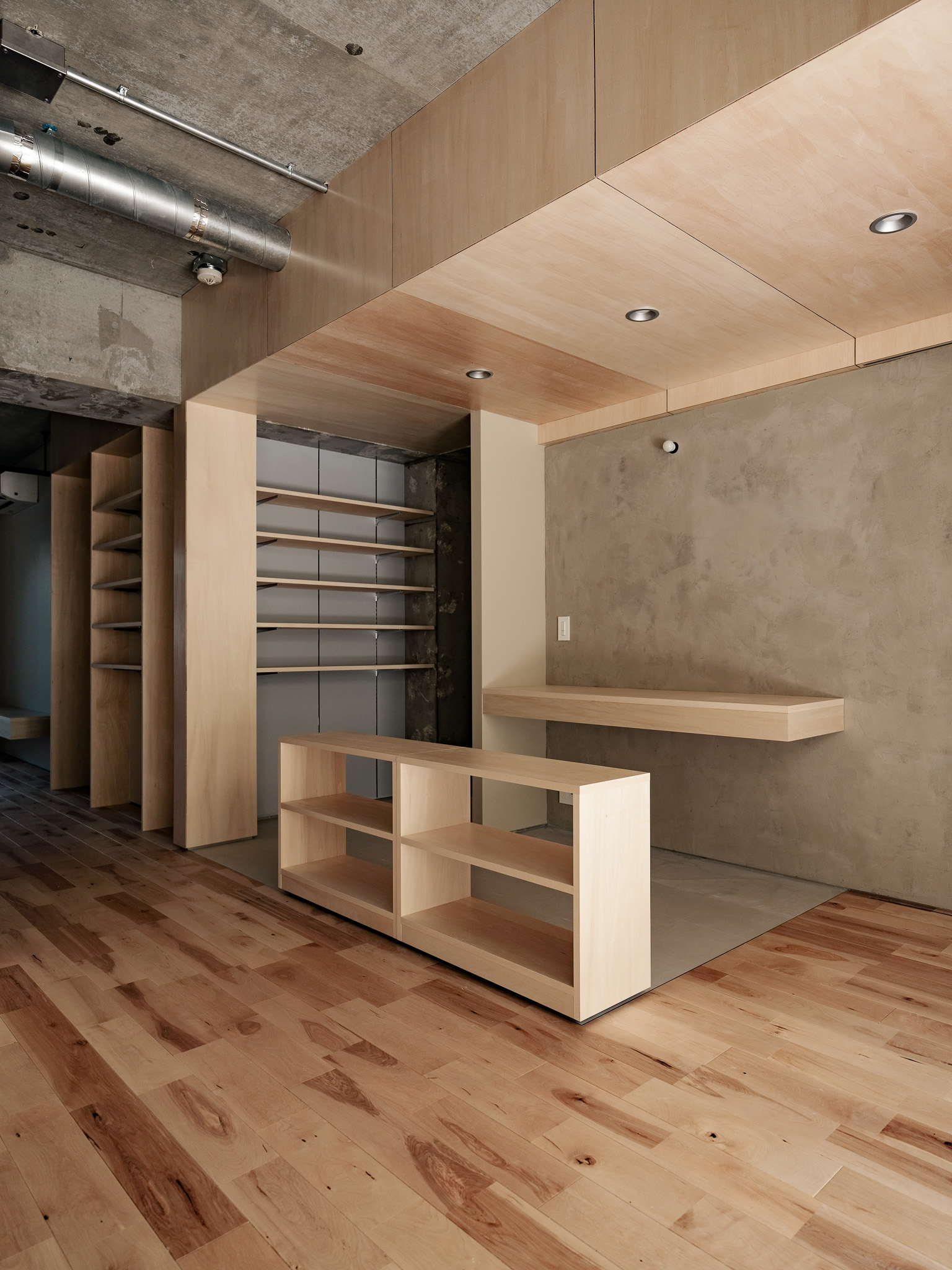 可動家具と無数の袖壁が取り付く、人や物の居場所となる境界面。
