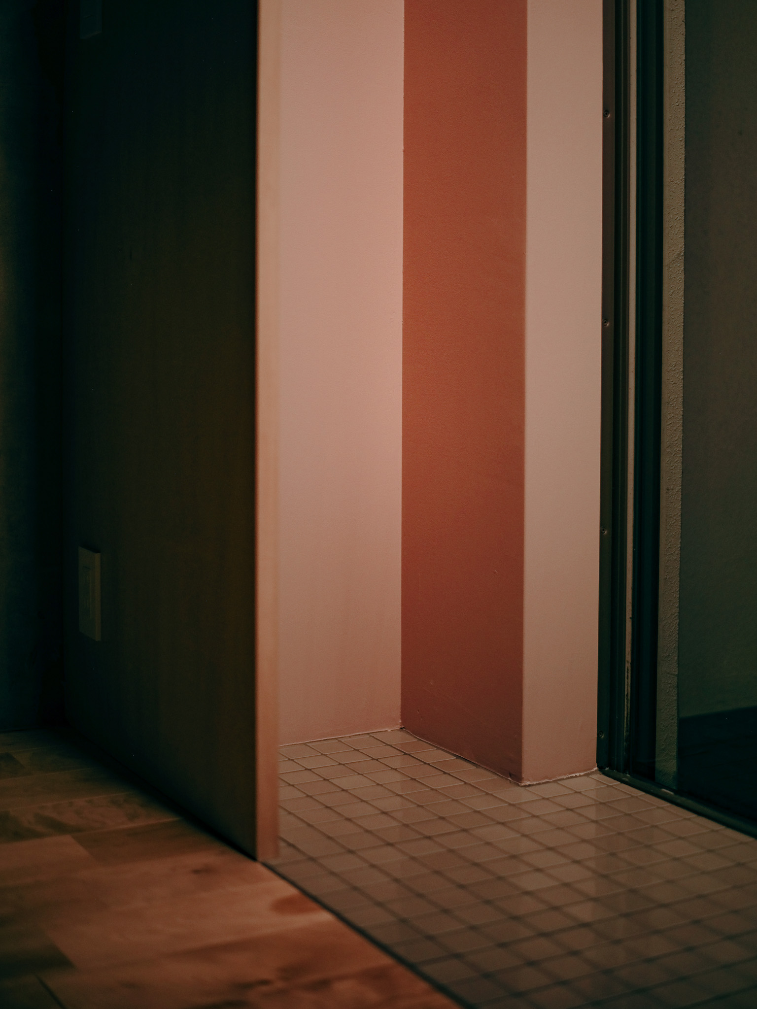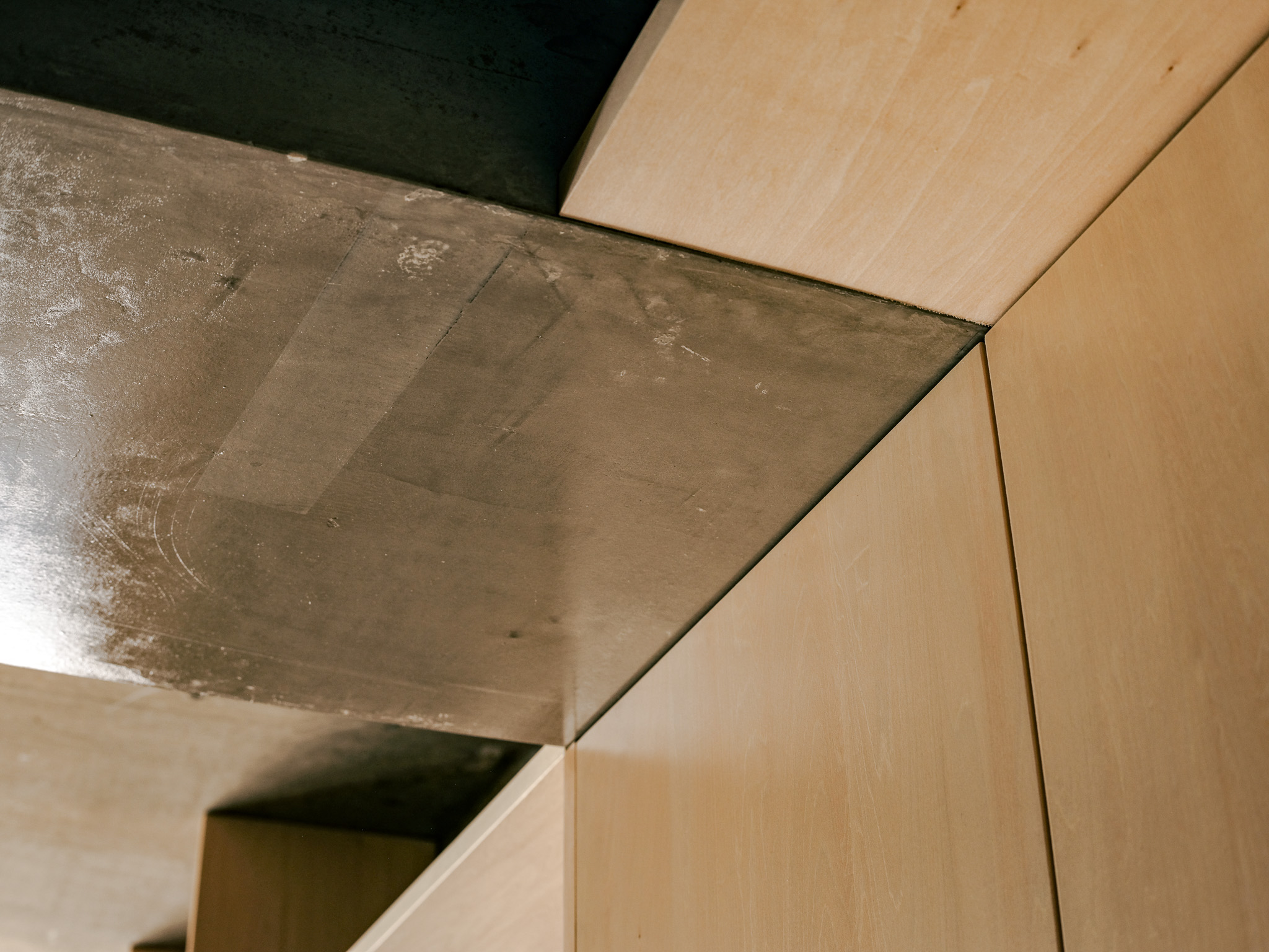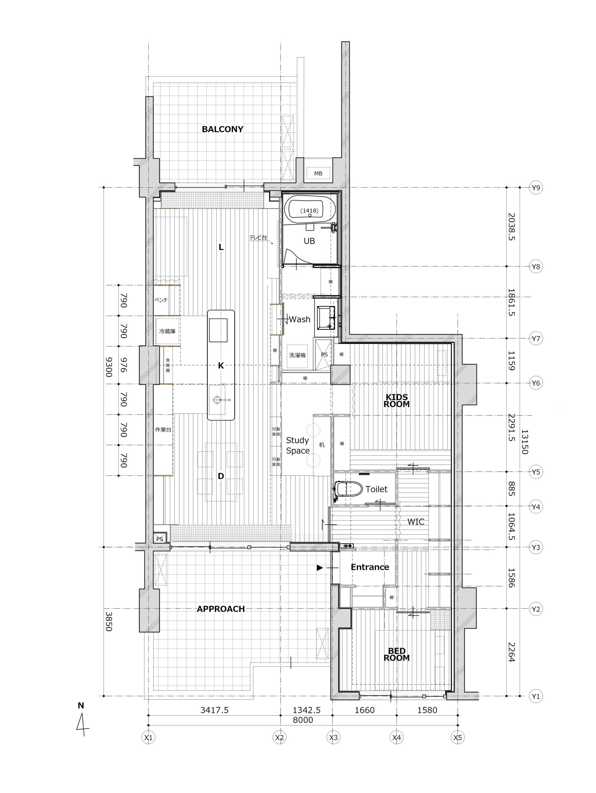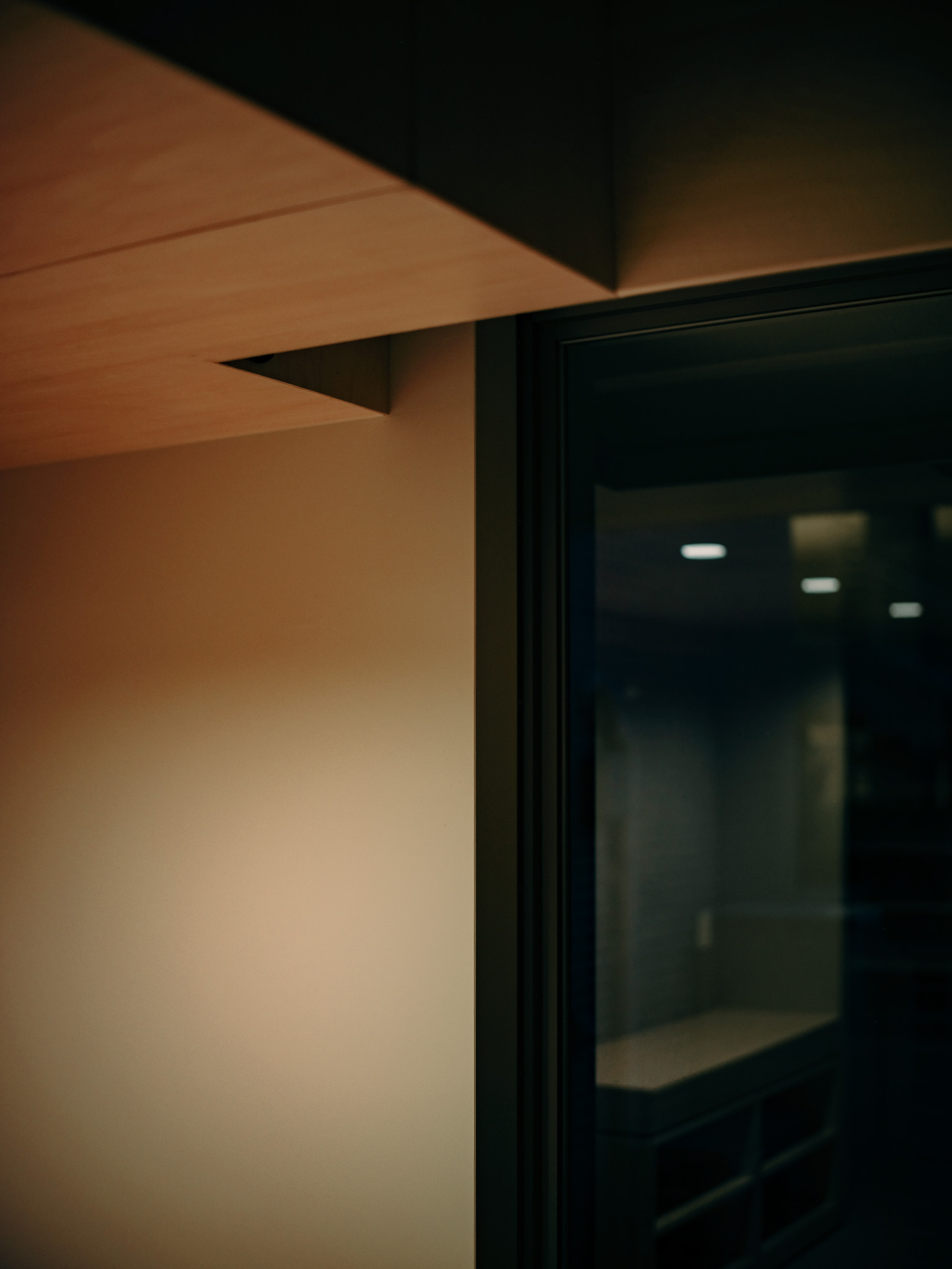 可動家具と無数の袖壁が取り付く、人や物の居場所となる境界面。
