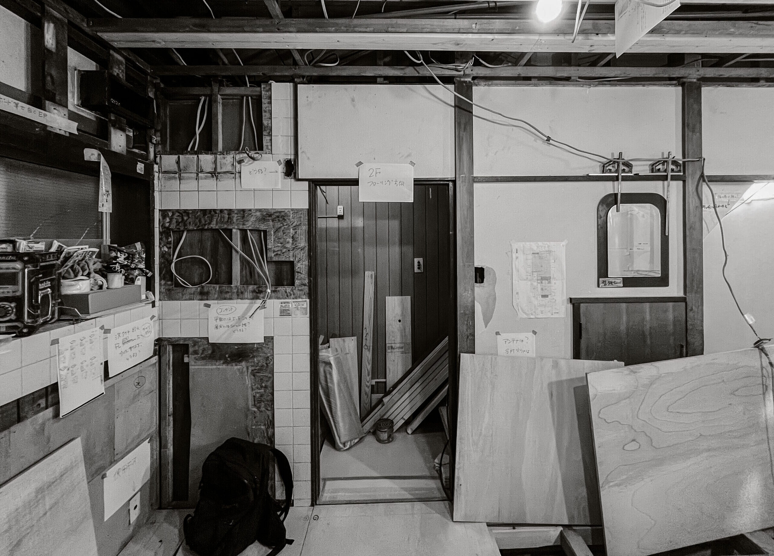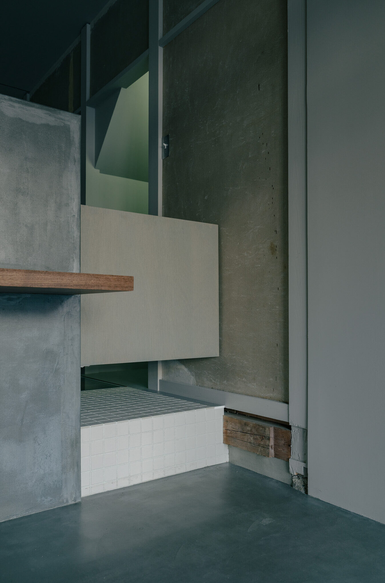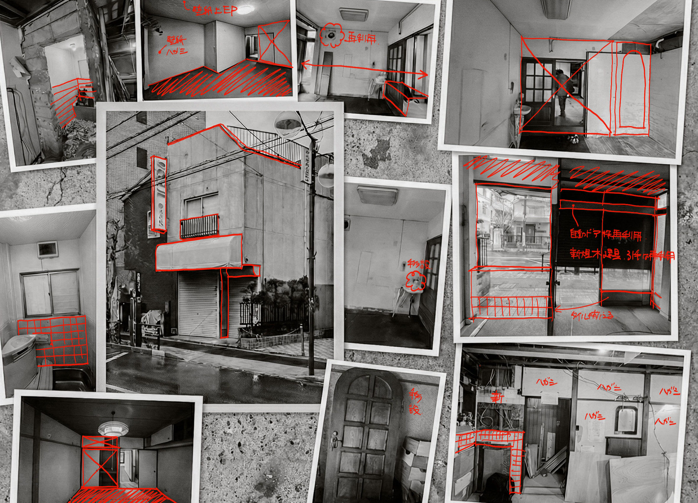 施主は既存の建物と、素材の時間による風化も気に入っていたため、それらをなるべく活用することを目指した。具体的には外壁塗装と各階の間仕切り壁を解体し、風通しを確保する以外は大きな改修はせず、元々のモルタル壁やタイル、自動ドアの枠等は現状のものを使用し、鉄部は現状の風化の進行を遅らせるための塗装の処置に留めた。